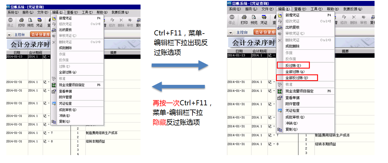 考虑到部分用户基于特殊应用场景,确实有反过账应用的需求,通过快捷键方式提供有限的反过账功能应用”